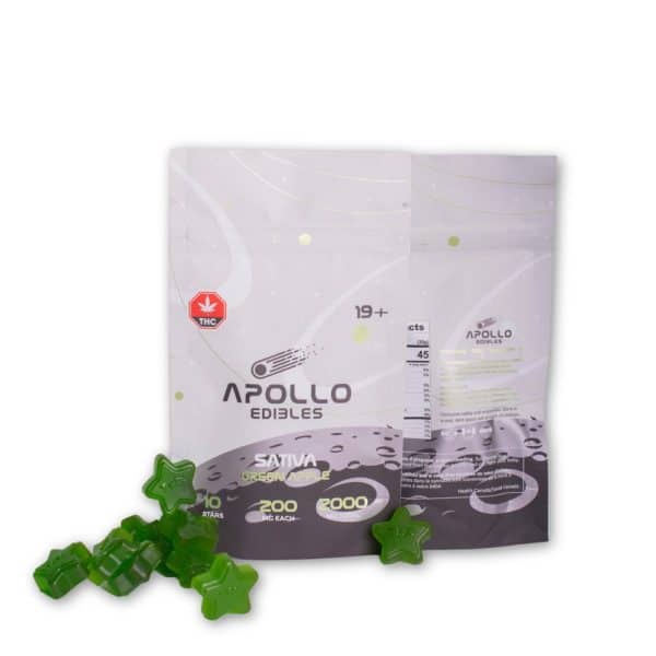 anxiety? The 2000mg Sativa dominant Apollo gummies are your ticket to tranquility. Indulge in explosive flavors in Green Apple as you take a star and prepare to delve into a whole new realm of relaxation. With the increased potency, each gummy can be easily divided into 5 pieces, offering flexibility for a wide range of tolerances.