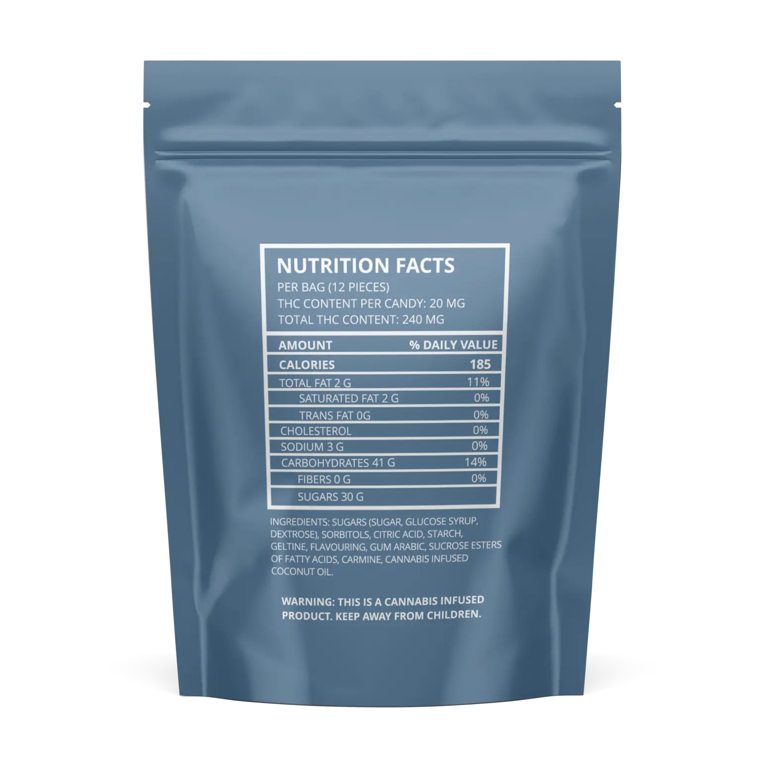 INGREDIENTS: SUGARS (SUGAR, GLUCOSE SYRUP, DEXTROSE), SORBITOLS, CITRIC ACID, STARCH, GELATINE, FLAVOURING, GUM ARABIC, SUCROSE ESTERS OF FATTY ACIDS, CARMINE, CANNABIS INFUSED COCONUT OIL.