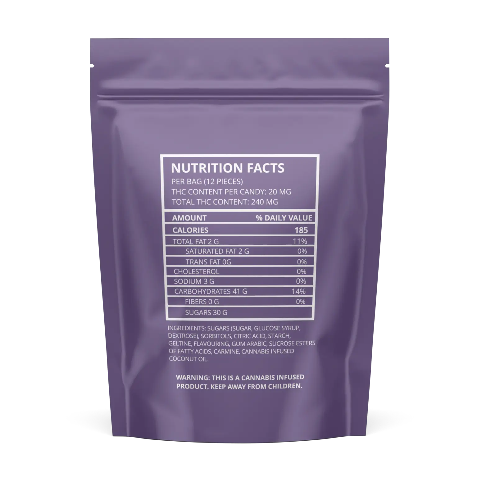 INGREDIENTS: SUGARS (SUGAR, GLUCOSE SYRUP, DEXTROSE), SORBITOLS, CITRIC ACID, STARCH, GELATINE, FLAVOURING, GUM ARABIC, SUCROSE ESTERS OF FATTY ACIDS, CARMINE, CANNABIS INFUSED COCONUT OIL.