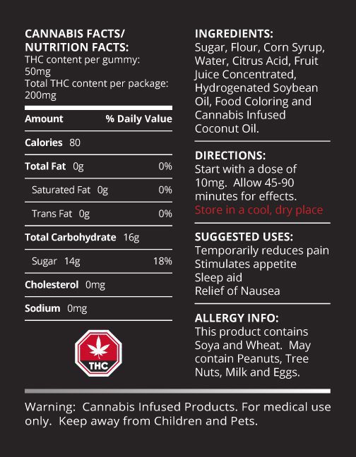DOSAGE: Each Sour Watermelon Slices is infused with 50mg THC. Begin with one candy and allow half an hour before ingesting more.